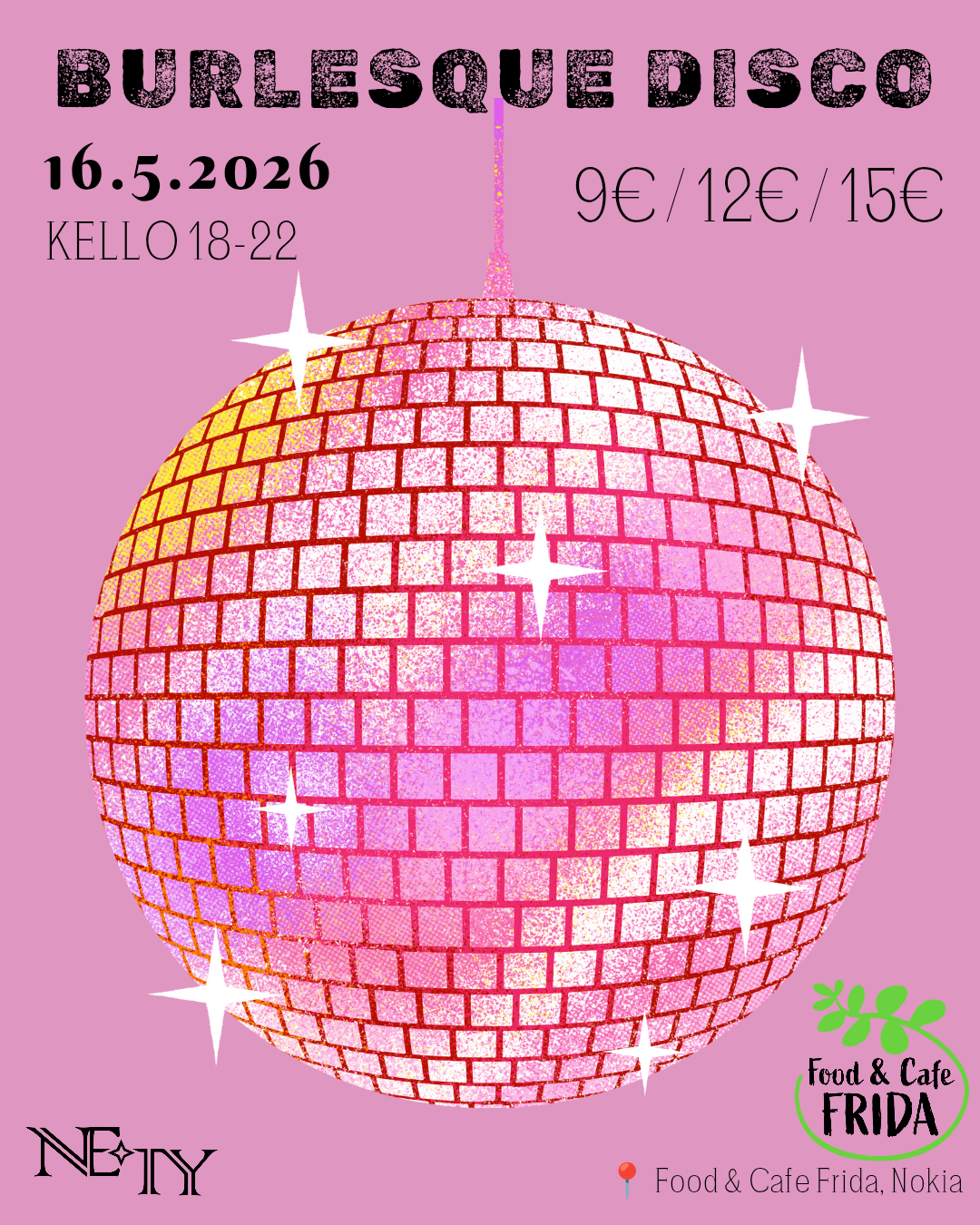Tervetuloa nauttimaan 80-, 90- ja 2000-luvun kuumimmista discohiteistä sekä nauttimaan pirskahtelevasta burleskista ihastuttavaan Food & Cafe Fridaan! Kaiva kimaltavin asusi kaapista ja tule valloittamaan tanssilattia meidän kanssa sekä nostamaan malja alkavalle kesälle!
